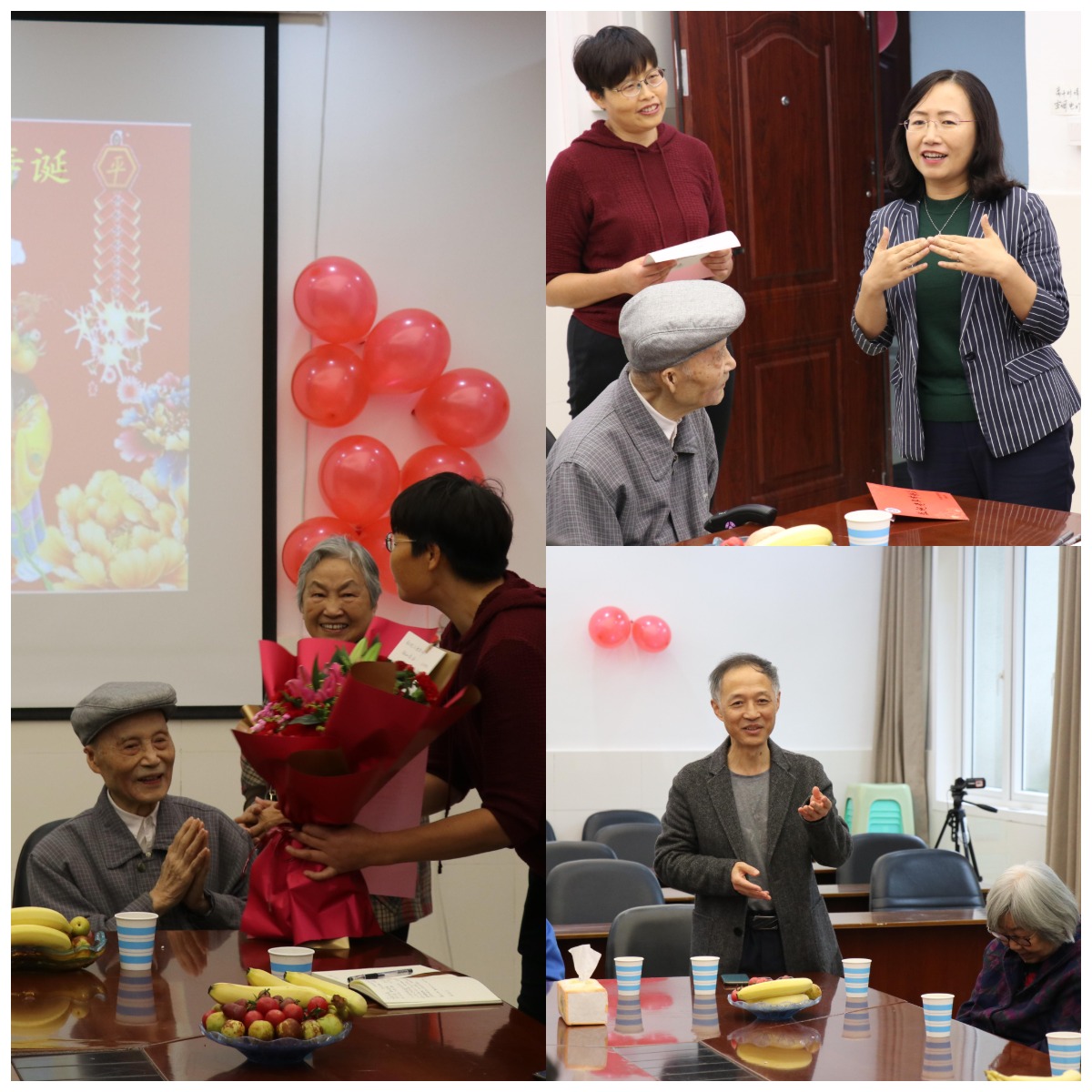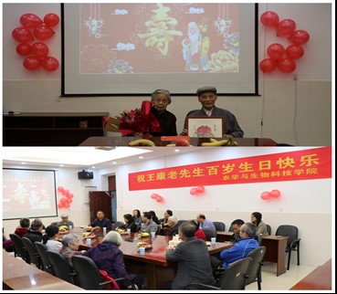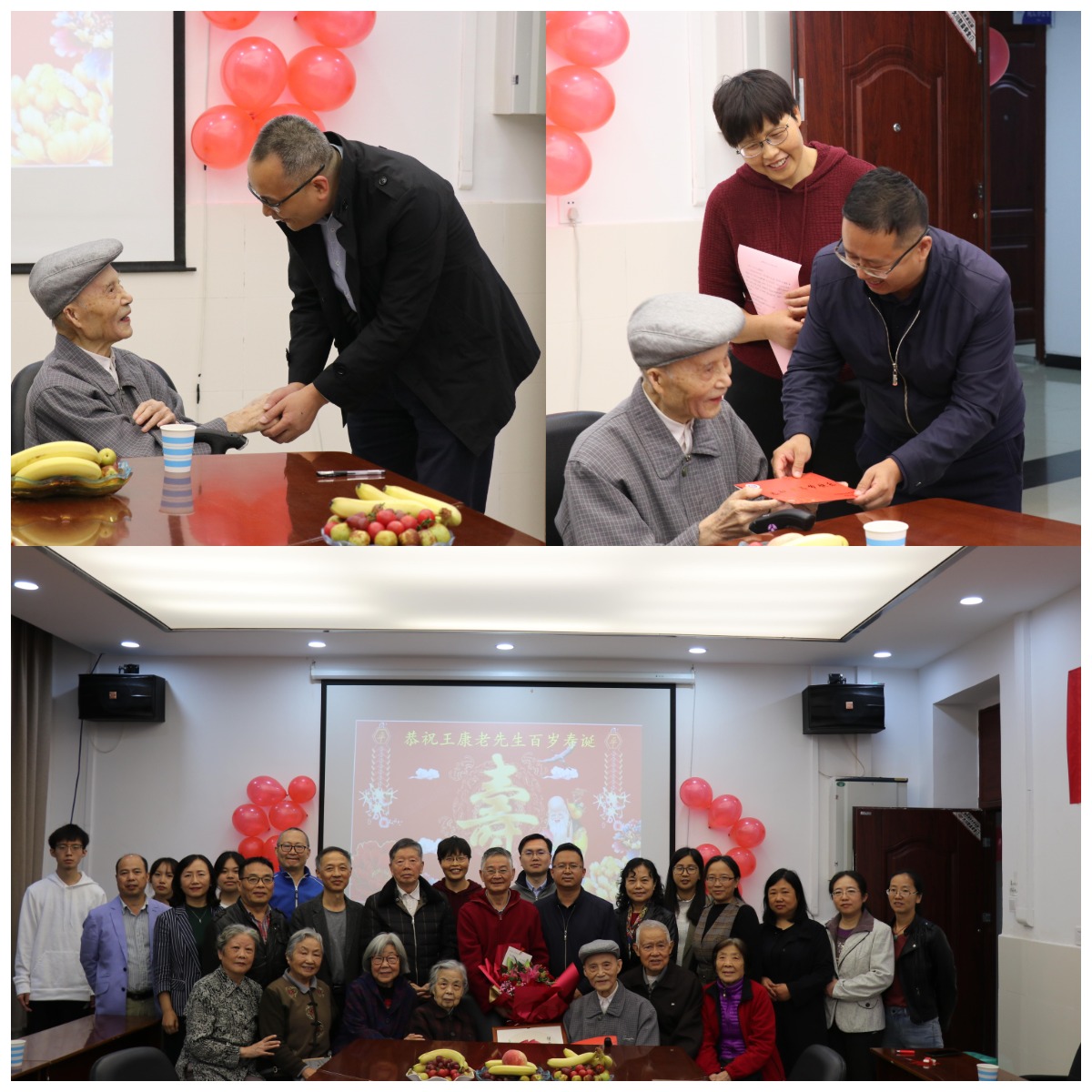 为老先生策划了这场别开生面的百岁寿辰茶话会。学院领导及在职、退休教师代表和王康老师的好友同事们参加了茶话会,共同祝福王康老师生日快乐,福寿安康!院老协小组长孙泽江老师献上鲜花及祝福,教研组同事吴珍龄老师献上自己创作的“双寿”图表示祝贺。王三根老师作为王康老师的学生代表向大家讲述了老先生在教育科研工作上无私奉献、与时俱进,敢为人先的精神。