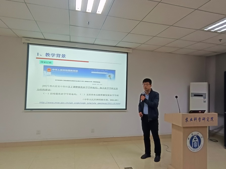 在“教师说教学”环节,植科系青年教师姚贺盛分享了所授课程《植物生理学》的教学方式方法。《植物生理学》是植物生产类学生的必修课,姚老师以课程内容、教学目标等为依据,探索出“线上+线下”的混合式教学模式,通过启发式、案例研究、创新项目引领、榜样力量牵引等多样的教学手段,调动学生的学习积极性,培养学生自主学习的能力和对农科领域的研究兴趣。
