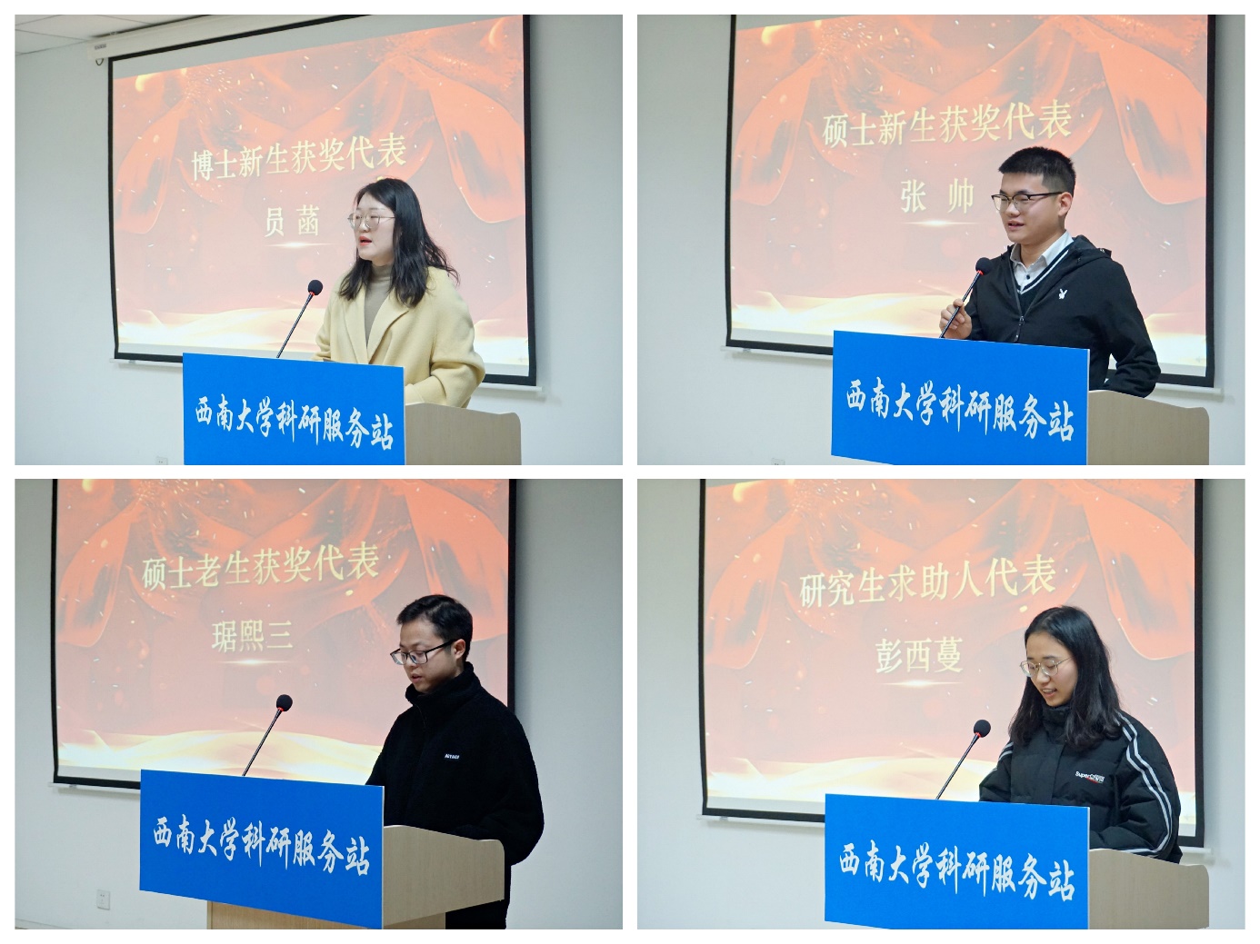 颁奖典礼第三项,分别由学校博士生获奖代表员菡同学、高年级硕士生获奖代表琚熙三同学、研究生新生获奖代表张帅同学和研究生求助人代表彭西蔓同学进行发言。员菡博士表示,在过去几个月的科研帮扶工作中,她亲历过服务站从刚组建时的寸步难行到如今的硕果初结,内心感慨万千,亦收获满满,她认为帮助学弟学妹们走出科研困境是一件非常幸运而又温暖的事,她希望自己能够继续为大家撑好这把“伞”。琚熙三同学感慨道,服务站组建时间虽然不长,但服务站始终紧紧围绕着求助同学的实际需求来实施援助,把力量用在了同学们最需要的地方,这种热爱科研的氛围和志愿服务师生的精神也给了自己很大鼓励,他希望今后能通过服务站帮助更多弟弟妹妹们解决科研瓶颈。张帅同学表示,服务站勇担时代大任的作为是十分令人鼓舞和振奋的,希望借此机会呼吁广大研究生以实际行动践行初心使命,助力他人、成就自我,并坚信服务站能够帮助更多有科研困惑的同学,续写新的辉煌。彭西蔓同学感慨道,在第一次向服务站发出求助时,是抱着试一试的态度,没想到很快就收到了服务站的援助,并且此后的每一次求助,服务站客服都会贴心指导,不仅解决了问题,更传递了温暖,真诚地希望服务站不断壮大,帮助更多求助人解决科研烦恼。