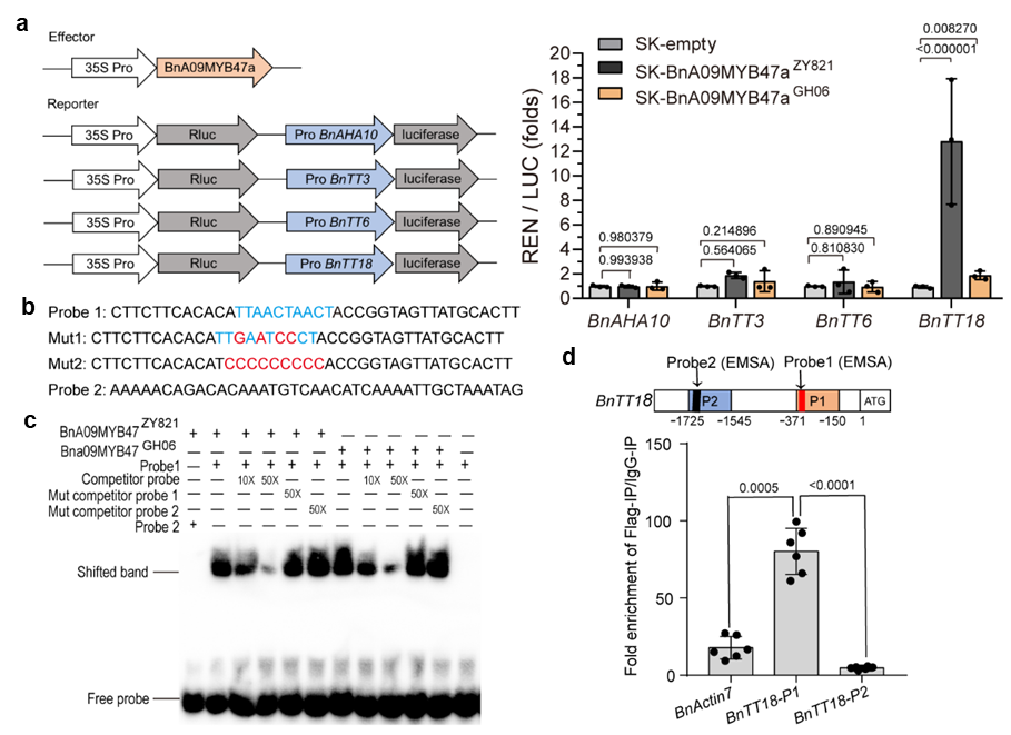 通过对过表达/沉默BnA09MYB47a转基因油菜研究,发现该基因与种皮色泽呈现正相关,还影响了芸薹属作物种皮色泽性状的重要组成成分表儿茶素、山奈酚、异鼠李素和花青素苷及其衍生物等类黄酮代谢产物的合成(图2)。此外,序列变异是黄籽和黑籽油菜BnA09MYB47a功能差异的基础,双荧光素酶试验、EMSA和ChIP-qPCR等体内外实验证明黑籽等位基因BnA09MYB47aZY821通过直接激活BnTT18的表达来促进黄酮类化合物的生物合成,而黄籽等位基因BnA09MYB47aGH06无显著调控作用(图3)。综上所述,该研究丰富了甘蓝型油菜参考基因组数目,特别是继唯一已公布的No2127黄籽参考基因组之后补充了新的黄籽基因组,为黄黑籽油菜基因组深入研究、优异基因资源的挖掘利用,培育高商业价值的油菜,促进芸苔属作物中黄酮类化合物合成代谢调控的分子机制研究提供理论依据和资源。
