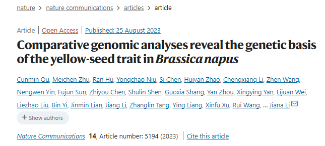 2023年8月25日,西南大学油菜分子生物学研究团队李加纳教授/曲存民教授在Nature Communications发表了题为Comparative genomic analyses reveal the genetic basis of the yellow-seed trait in Brassica napus的研究论文,该研究通过甘蓝型油菜黄籽GH06和黑籽中油821高质量基因组的组装,围绕控制种皮色泽主效QTL区间,成功克隆了一个控制油菜种皮色泽重要基因,并解析了其参与调控种皮色泽形成和类黄酮代谢的分子机制,为油菜品质性状改良提供了新的分子策略。