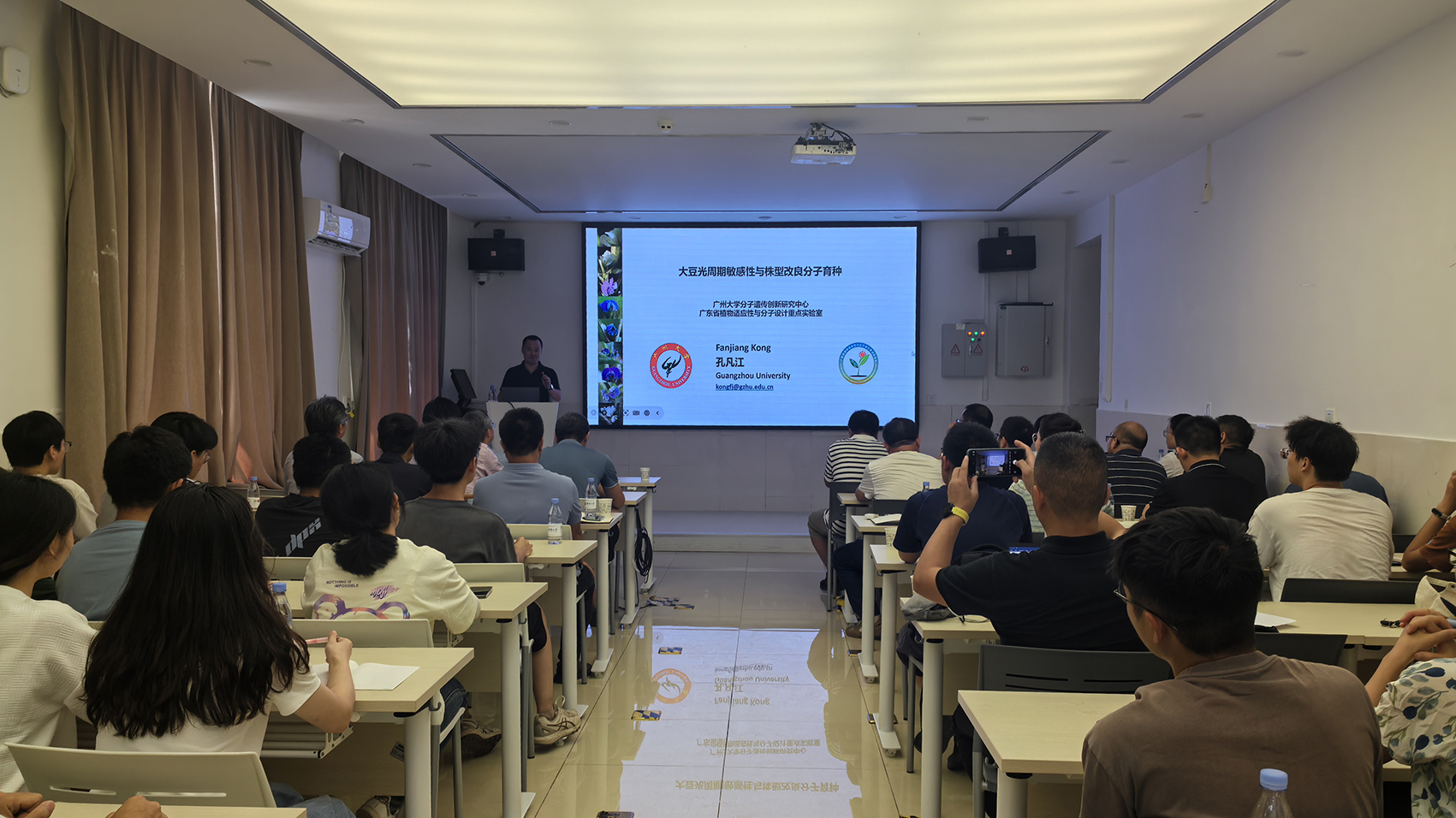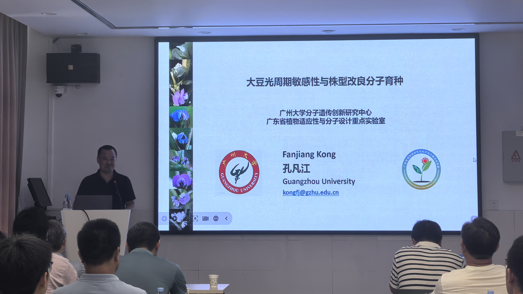 孔凡江教授在报告中讲述了光周期调控大豆开花的分子机制,揭示了大豆光周期现象和光周期敏感性的分子遗传基础,证明了光周期适应性基因在驯化与变异过程中的选择规律和提高大豆适应性与产量的重要机制。此外,他还讲述了最新研究成果Rin1调控大豆节间距的分子机制,以及rin1在高密度种植条件下显著提高大豆产量。报告会上,参会老师还与孔老师进行了深入的学术交流。