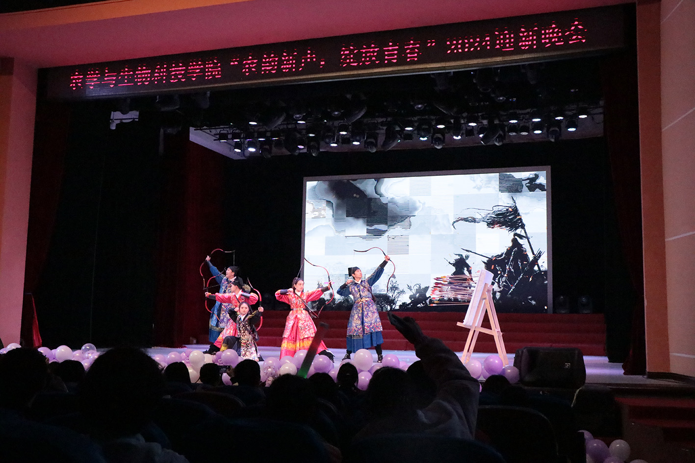 在璀璨灯光与振奋人心的开场视频引领下,晚会正式拉开帷幕,一场关于青春、梦想与时代的视听之旅就此展开。在“听·农韵悠扬”篇章中,射艺表演《流行逐月》以满月为背景,箭矢划破夜空,展现了古代武术艺术的独特魅力。五位少女表演的舞蹈《DIAMAND》则如同璀璨的钻石,散发出青春的光芒与活力。《何日》凭借饱含情感的吟诵,引发观众对战争与和平的深刻反思。歌曲《迎风逐梦,赤子青春》用铿锵有力的声音激励同学们在青春的路上奋勇向前。