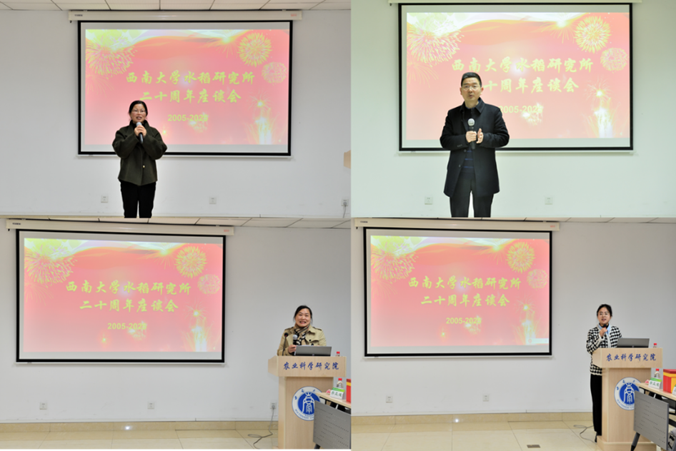 领导在讲话中充分肯定了水稻所20年来取得的显著成绩,并对水稻所未来的发展寄予了厚望。李平、桑贤春、游静等分别代表水稻所早期毕业学生和在读学生代表发言,分享了自己在水稻所学习期间的难忘故事,表达了对水稻所的感激之情和对未来的美好祝愿,展现了在读研究生们对未来的信心与决心以及传承和发扬水稻所不畏困难,勇攀高峰科研精神的坚定信念。最后,何老师进行了总结致辞,表达了对水稻所未来发展的信心,并鼓励在场的每一位师生继续努力,传承和发扬水稻所的优良传统,为实现水稻所的新目标而努力奋斗。