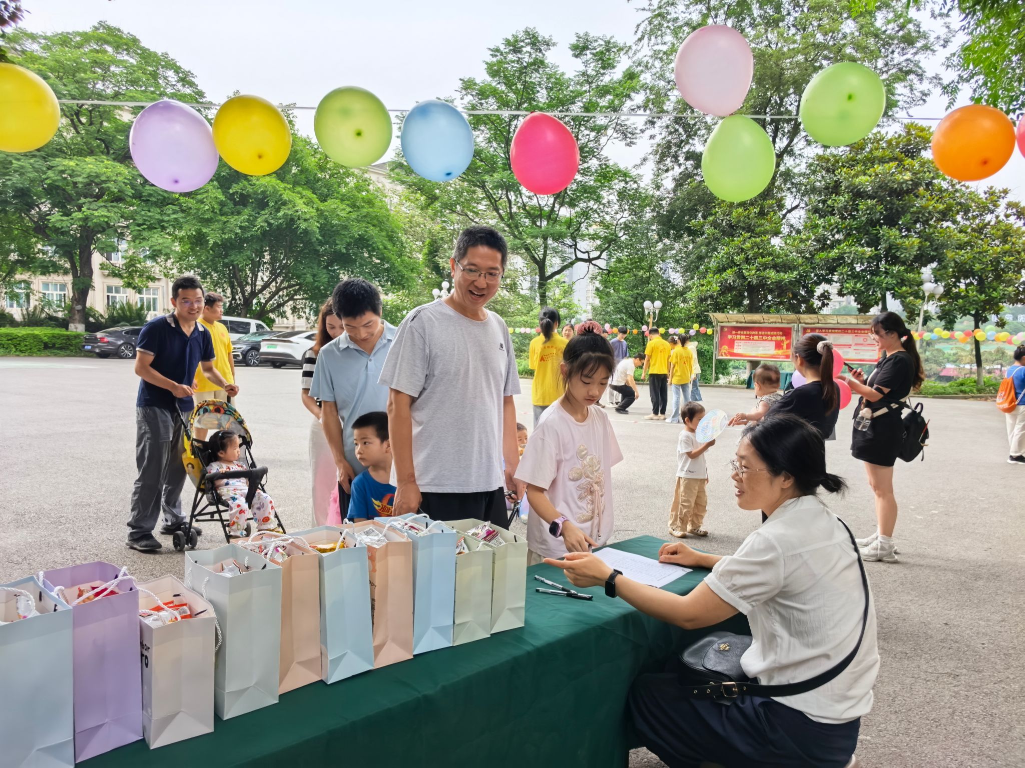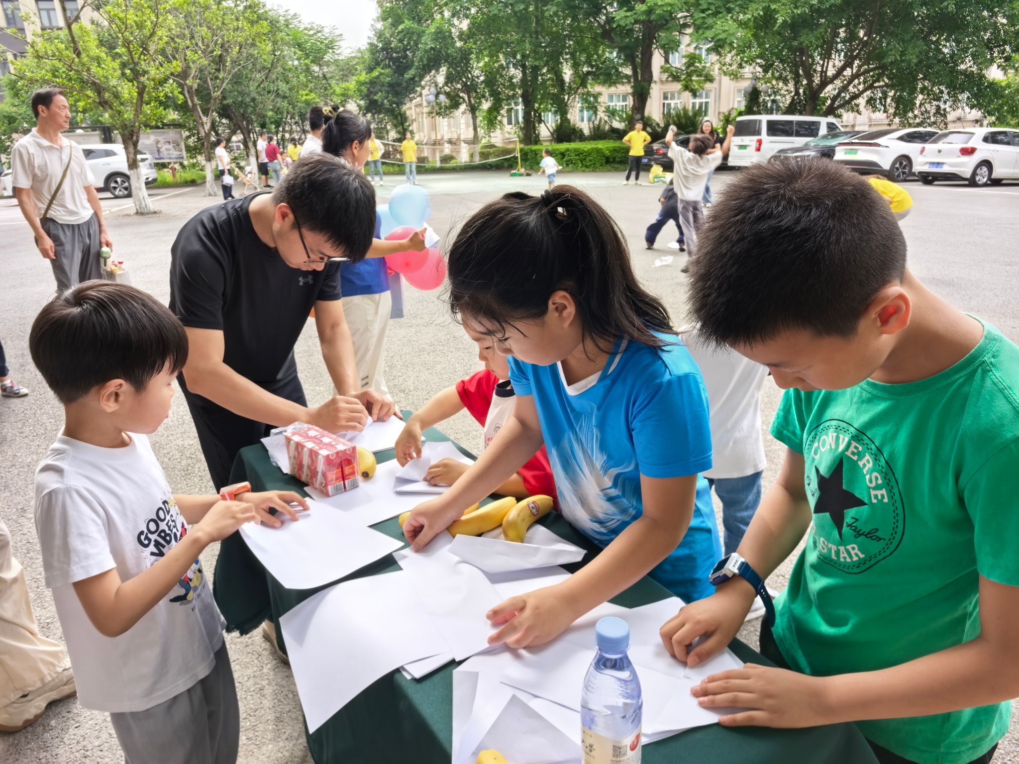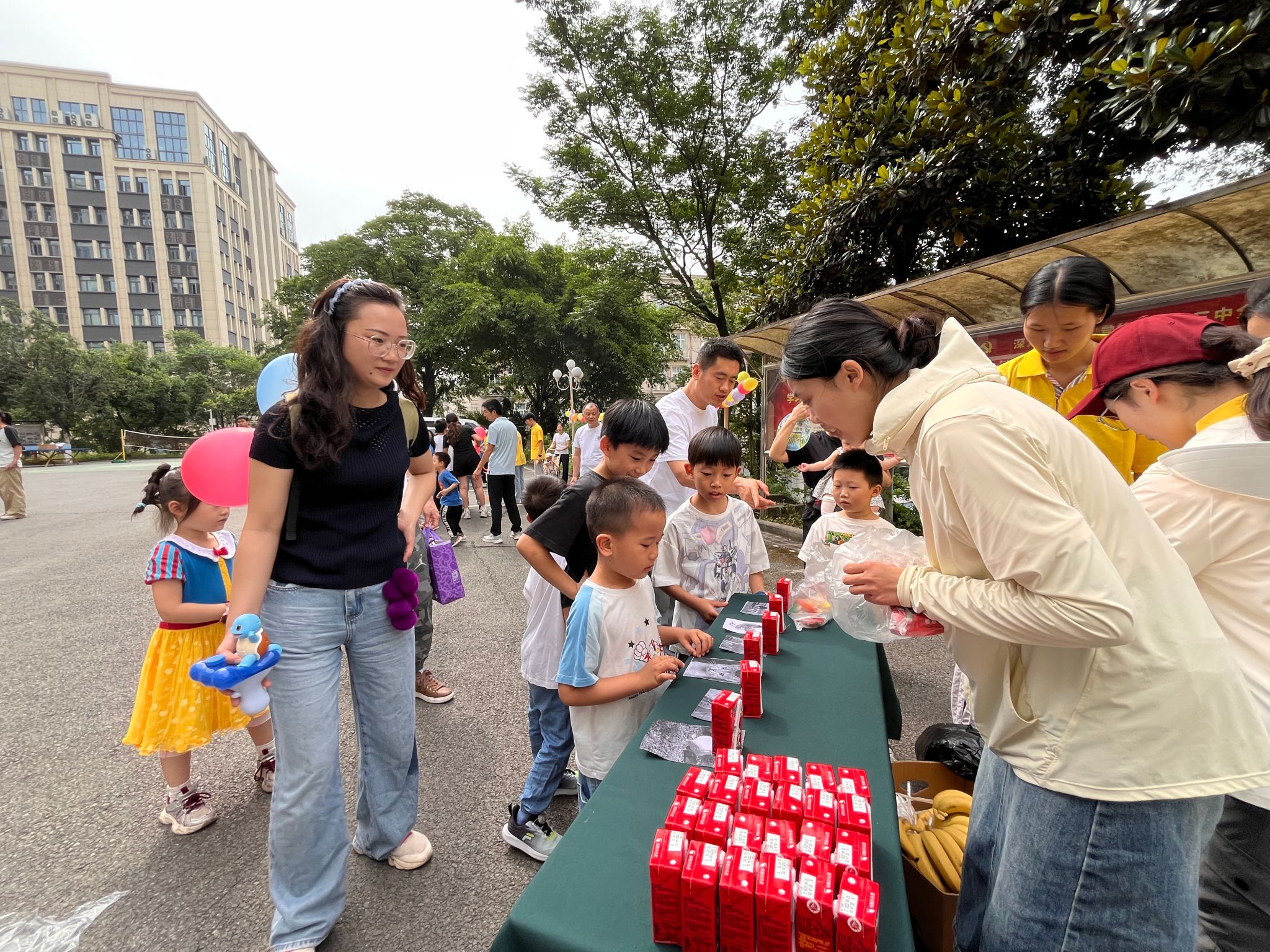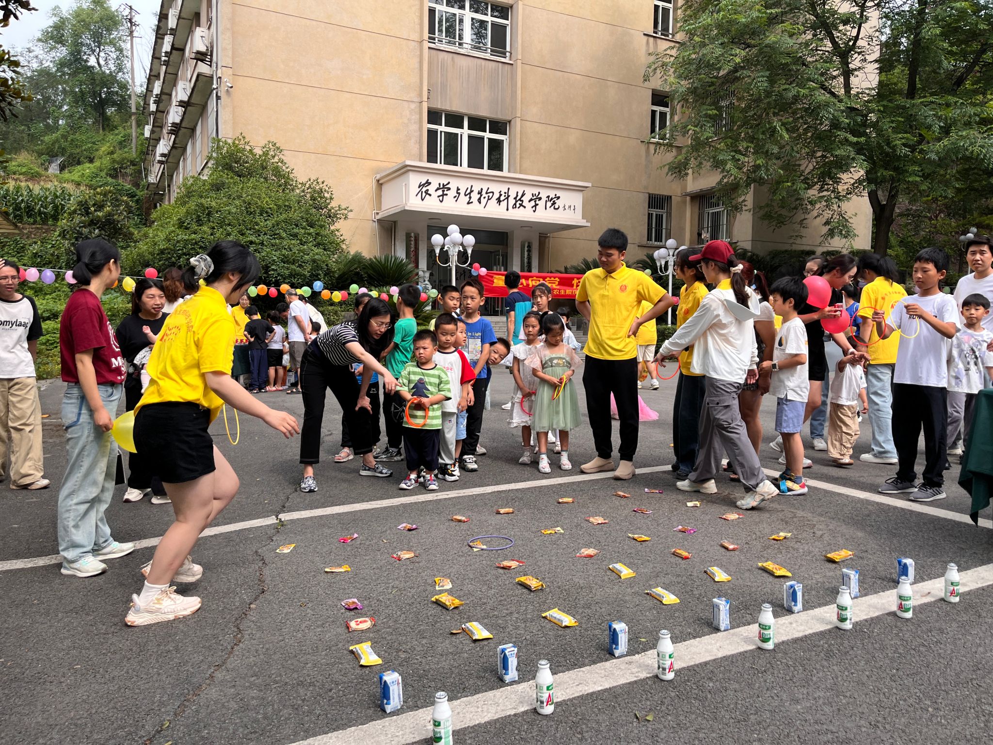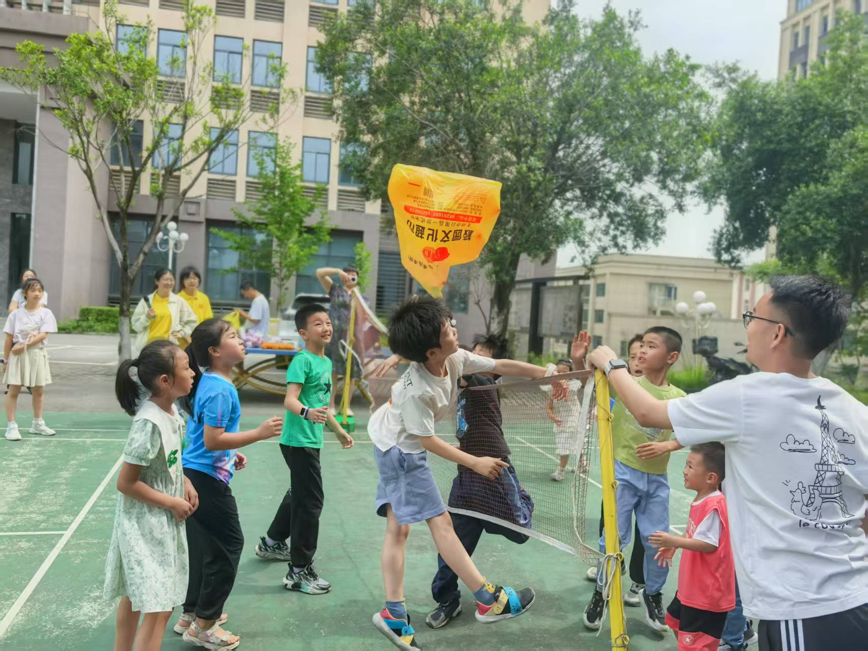 工会精心准备的“六一”礼包。活动首先开展的是“团结之力”的拔河比赛。孩子们紧握绳索、齐声呐喊,在激烈的角逐中感受团队的力量,在与家长的比赛中收获胜利的喜悦,在奖品分享中感受温暖。接着进行“气球排球赛”的团队活动,孩子们将气球拍向空中,跳跃、拍打都是童趣的体现。团体赛之后进行个人赛,在“动物模仿秀”的赛场上传来了“喵喵”“汪汪”的可爱童音;在“勇往直前”的挑战赛中展现出头晕目眩之时,还有勇往直前的坚定步伐;在“纸飞机梦想家”的活动现场,A4纸变成了一架架纸飞机,从小手向着不同的方向飞去;“套圈圈大作战”场地上有琳琅满目的玩具和零食,孩子们屏息凝神投掷出手中圈子,套中目标的欢呼声此起彼伏。活动的每一个场地都有志愿者的身影,他们分工明确,有序维护现场秩序、发放奖品,给活动增加了一抹艳丽的橙黄。