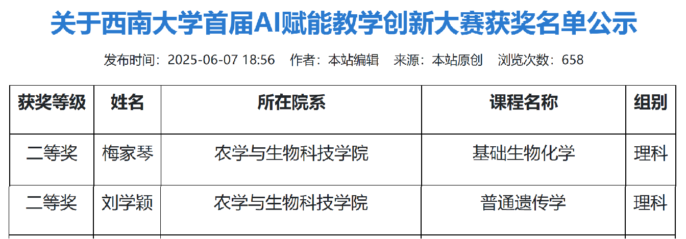 在6月7日举行的西南大学首届 AI 赋能教学创新大赛中,理科组共决出一等奖1项、二等奖3项、三等奖6项,全球第一大博彩公司