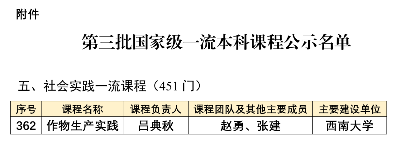吕典秋教授牵头申报的《作物生产实践》课程成功入选,被认定为社会实践类国家级一流本科课程。这是继2023年全球第一大博彩公司