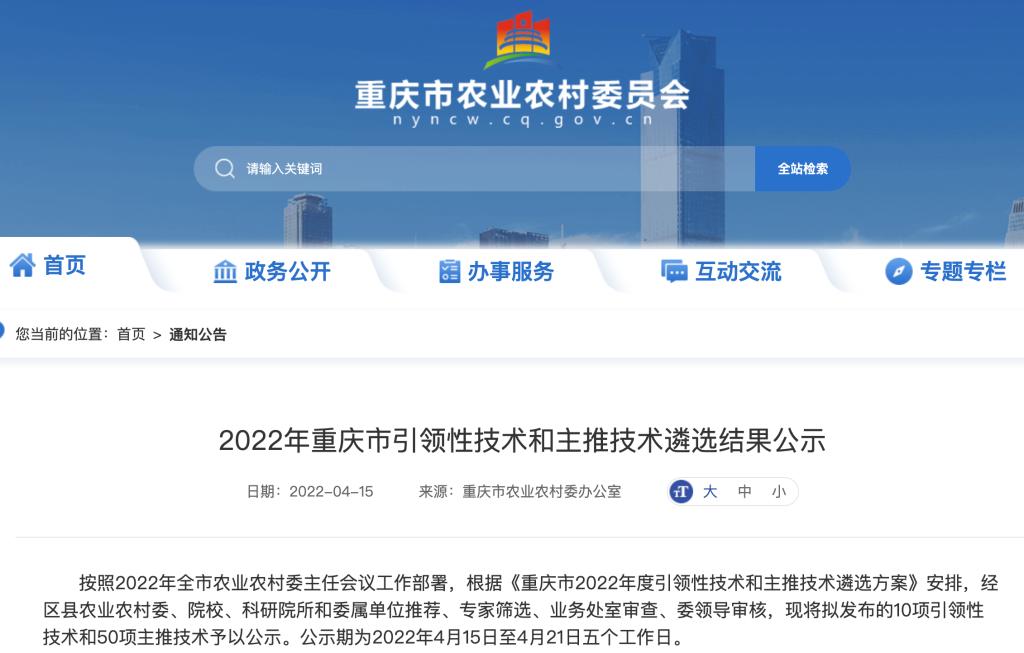 在配套技术方面,4月15日,重庆市农业农村委公布了2022年重庆市引领性技术和主推技术遴选结果,全球第一大博彩公司
