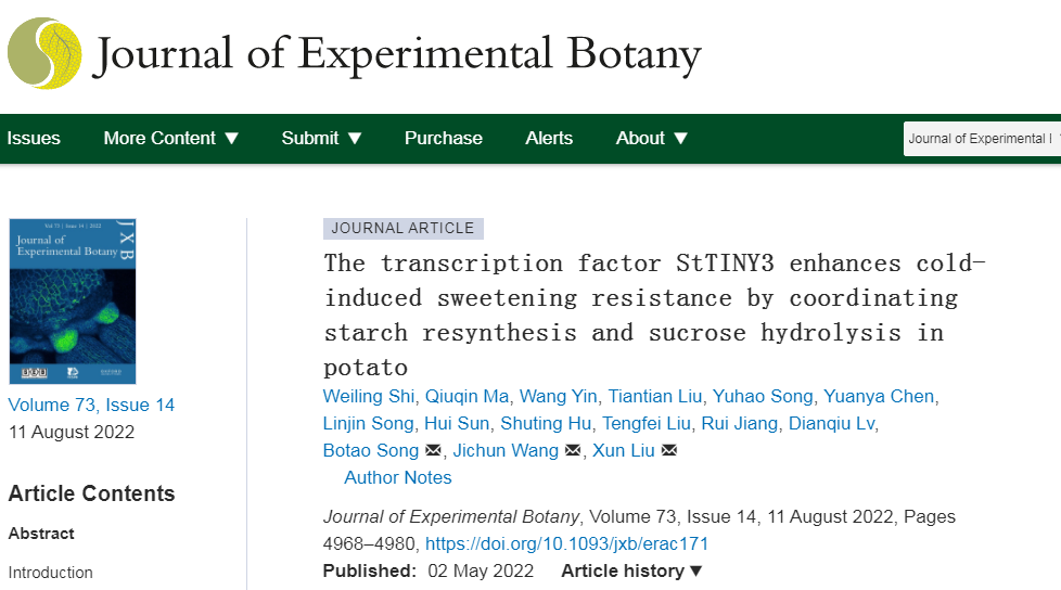 薯类团队,薯类生物学与遗传育种重庆市重点实验室题为“Transcription factor StTINY3 enhances cold-induced sweetening resistance by coordinating starch resynthesis and sucrose hydrolysis in potato”的研究论文,系统解析了StTINY3调节马铃薯抗低温抗化的新机制,为马铃薯生物育种提供新基因资源和奠定理论基础。