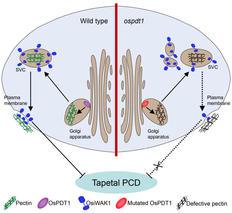 图3:OsPDT1通过果胶合成途径,参与果胶信号元件OsiWAK1的定位与功能调控,最终影响绒毡层细胞的程序化死亡进程。