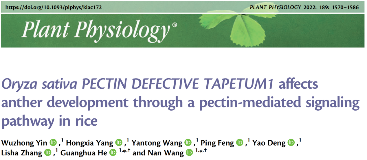 2022年4月19日Plant Physiology ( IF2021=8.005) 在线发表了西南大学水稻研究所的最新研究成果“Oryza sativa PECTIN DEFECTIVE TAPETUM1 affects anther development through a pectin-mediated signaling pathway in rice”。该研究以果胶合成相关的半乳糖醛酸基转移酶突变体oryza sativa pectin defective tapetum1 (ospdt1)为研究对象,发现它的绒毡层细胞程序性死亡(PCD)提前,并产生了完全败育的花粉粒。与其它发生果胶缺陷的突变体不同,ospdt1突变体的果胶含量与野生型差异较小,起结构支撑作用的细胞壁果胶没有明显的缺陷。进一步研究发现WAK家族蛋白OsiWAK1在ospdt1突变体细胞内的分布受到了影响,OsiWAK1的敲除植株与ospdt1突变体出现了相似的绒毡层PCD提前,在ospdt1背景的水稻中超表达OsiWAK1部分恢复了ospdt1的缺陷。因此,该研究认为ospdt1突变体中的果胶合成缺陷影响了OsiWAK1蛋白在细胞内与果胶的整合与运输,进而影响了其功能,并导致绒毡层PCD提前。这一发现为植物体内的果胶如何发挥其生物学功能提供了新的见解(图3)。