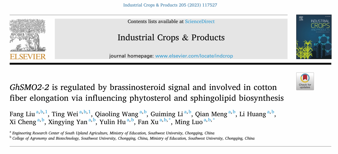 棉花纤维细胞是一个极细长的单细胞,是研究植物细胞生长发育的理想材料。植物激素油菜素内酯(BRs)在纤维细胞发育中起着重要作用。近日,西南大学罗明教授团队在Industrial Crops and Products(IF2022=5.9)发表了题为《GhSMO2-2 is regulated by brassinosteroid signal and involved in cotton fiber elongation via influencing phytosterol and sphingolipid biosynthesis》的研究论文,揭示了受油菜素内酯调控的固醇合成酶基因GhSMO2-2通过影响植物固醇和鞘脂的合成影响棉花纤维发育的分子机制。