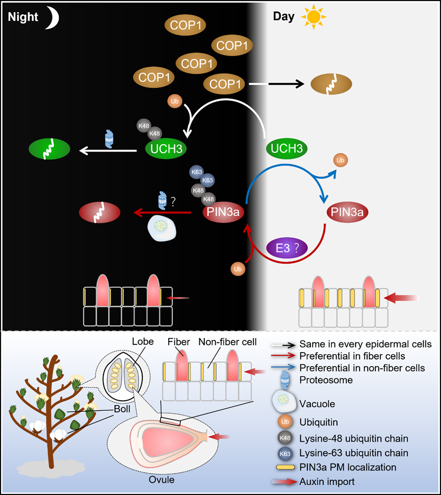 棉花是重要天然纤维作物,其生长发育贯穿整个夏季。棉纤维的发育与光照密切相关。然而,光信号是如何转化为棉纤维发育的调控指令,其背后的分子机制一直不清。该研究在前期揭示生长素以及PIN3a介导的极性生长素运输在促进纤维发育、改良棉花纤维产量和品质的基础上,证明光照对纤维起始和伸长调控是通过PIN3a实现。PIN3a作为影响纤维发育的关键生长素外排载体,其在棉花胚珠表皮中的定位极性和稳定性受到精细调控。光信号通过“COP1–UCH3-PIN3a”这一核心模块直接影响胚珠表皮的极性生长素运输。