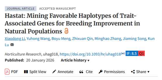 油菜分子育种团队在Horticulture Research上在线发表了题为“Hastat: Mining Favorable Haplotypes of Trait-Associated Genes for Breeding Improvement in Natural Populations”的研究论文,该研究开发了一款基于Python语言的综合性基因优异单倍型挖掘工具Hastat (//github.com/swu1019lab/hastat),同时也提供了在线分析平台 (//brassicaibd.cn/analysis/haplotype),将在未来的群体遗传分析和基因组设计育种中发挥重要价值。