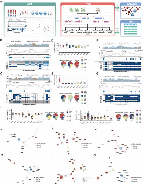 Hastat采用了模块化设计,包含分析(View)、统计(Stat)、网络(Network)和绘图(Plot)四个模块,使用户能够快速获得基因区域的单倍型和选择信号信息的同时,还能进一步完成单倍型网络的深入探索和高质量的可视化输出。为了全方位验证 Hastat 工具的解析能力与稳健性,研究团队整合了来自全球的 1,662份 甘蓝型油菜重测序种质资源,利用 DeepVariant 高精度检测并过滤构建了两个大型变异数据集(BnaWGS-1007 和 BnaWGS-655),并利用Hastat深入解析了两个控制开花时间的关键基因: BnFT.A02和BnFLC.A10。在选择机制上,两者展现了截然不同的进化命运,BnFT.A02 区域表现为高核苷酸多样性的平衡选择 (Balancing selection),保留了适应性灵活性;而 BnFLC.A10 则在启动子及编码区检测到了强烈的人工选择信号(Selective Sweep)。进一步的单倍型网络分析重现了油菜从欧洲冬型向中国半冬型及春型生态型驯化的历史轨迹:在这一过程中,以冬型为主的BnFT.A02 晚花单倍型(Hap1,约180天开花)频率逐渐降低;相反,携带自然变异的 BnFLC.A10 早花优异单倍型(Hap1, Hap4, Hap6,约165天开花)在半冬性群体中被显著富集。这一选择过程极大地促进了如“中双11号”等现代半冬型品种的形成,充分展示了Hastat在解析重要性状演化机制中的强大效能。
