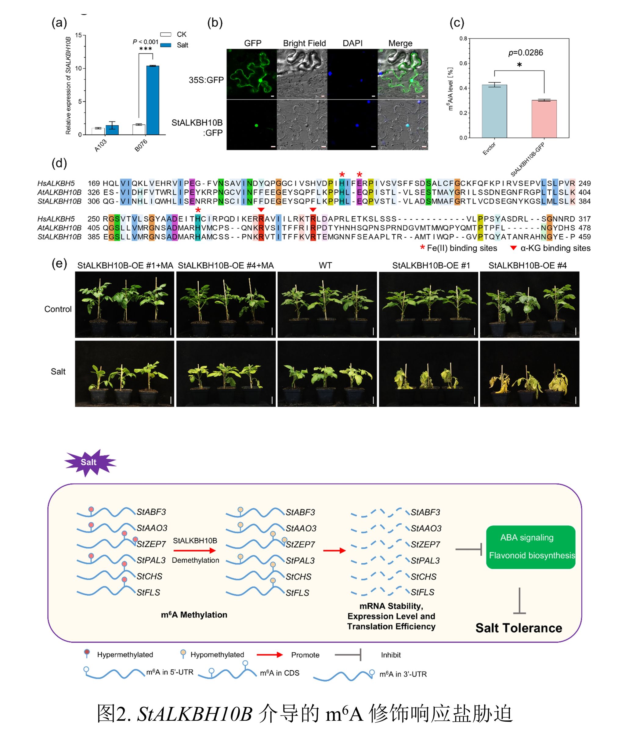 吕典秋课题组在植物学领域国际知名期刊《Plant Biotechnology Journal》上发表题为“StALKBH10B-mediated RNA m6A modification inhibits potato salt tolerance by targeting flavonoids and ABA signaling pathways”的研究论文。该研究首次在全转录组水平解析了m6A甲基化修饰调控马铃薯耐盐性的分子机制,阐明了StALKBH10B通过协同调控ABA信号和类黄酮合成两条关键通路影响盐胁迫应答的分子网络,为深入理解马铃薯耐盐性的表观调控机制提供了新见解,也为耐盐马铃薯种质创新提供了新的分子靶点和育种策略。