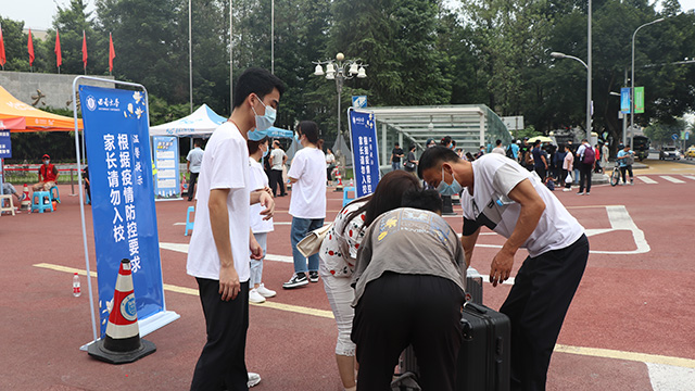 早上7点,2号门口一片红色,红的是横幅,红的是志愿者鲜艳的衣服,更是朝阳下学长学姐们的热情与温暖。志愿者们有序的帮助新同学搬运行李,指示方向。进入校门后,校门口防疫登记志愿者为每一位新生检查相关信息。学校安保人员及志愿者引导学生进行防疫登记并保持间距入校,对每一个入校人员进行登记测温,全力保证师生健康安全。志愿者们提着沉重的行李,推着箱子,同时细心的回答学弟学妹们的问题,介绍学校的布局。那一张张青春的面容,彰显着西大的朝气与蓬勃。一张张热情的笑脸,一句句亲切的问候,一项项贴心的服务,迎接着来自祖国各地的莘莘学子。不惧炎热的太阳,不辞辛劳地帮同学们把行李搬,让新同学切实感受到来着西南大学学长学姐的亲切和热情。