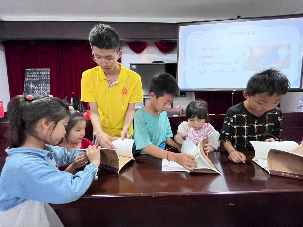 “哇,白花真的变红啦!”笑声与鼓掌声从趣味实验科普课堂传出。趣味实验包含“变色花朵”“吃糖的小土豆”“分不开的书本”,实践队刘欣璐同学用风趣的语言讲解着,带着孩子们手把手体会实验的精妙反应,将实验复杂、枯燥的原理部分以生动的方式带孩子们理解,为孩子们种下科研的种子,培养乐于探索原理的好奇心。