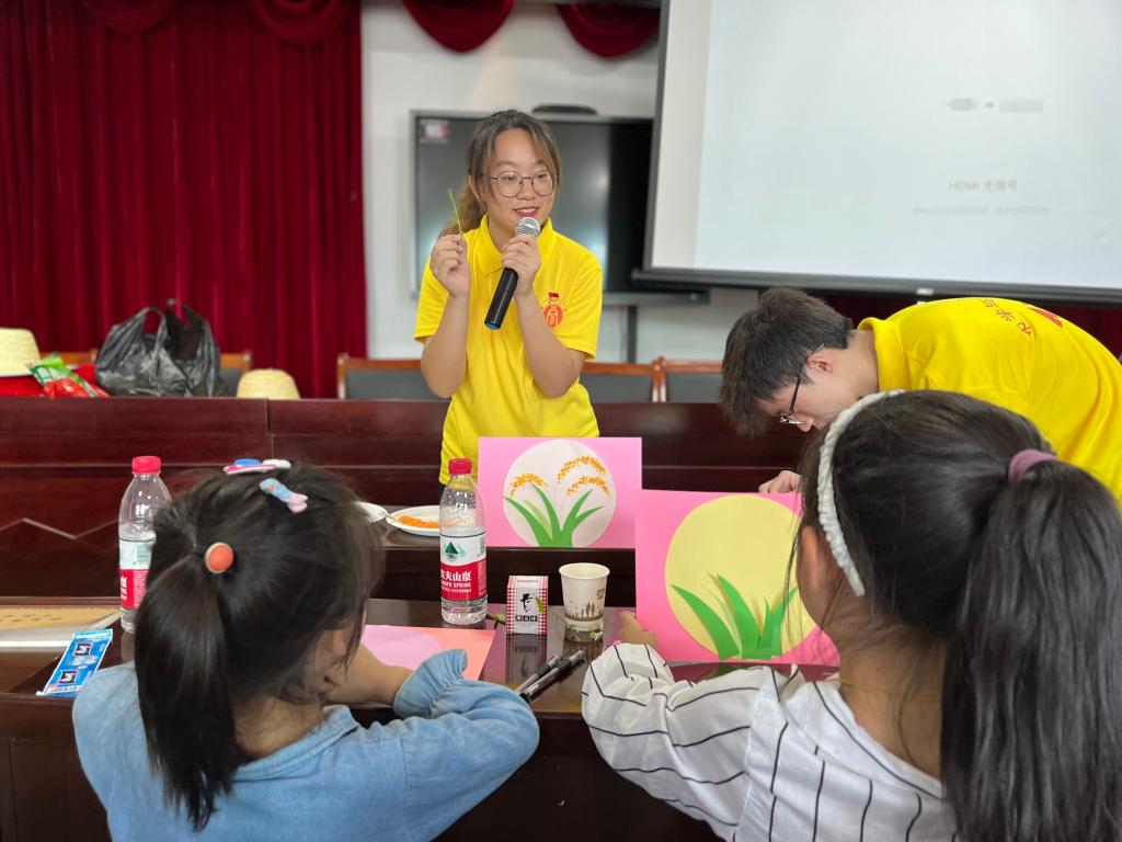 以“水稻”为主题,实践队陈倩同学带领小朋友制作与主题相关的绘画、折纸、手工等美术作品,开展趣味美术小课堂。“一片一片把水稻的叶子贴上”“用小水彩笔给水稻点缀上金黄的稻穗”孩子们低着头,小手拿起叶子轻轻地放在卡纸上,再用小手轻轻地压紧粘牢。实践队陈倩同学说:“看着小朋友们这么认真,感觉自己所做的努力没有白费,只要我这一点点的讲授能够启发他们的兴趣、能够带给他们快乐,就是对我最大的肯定”。