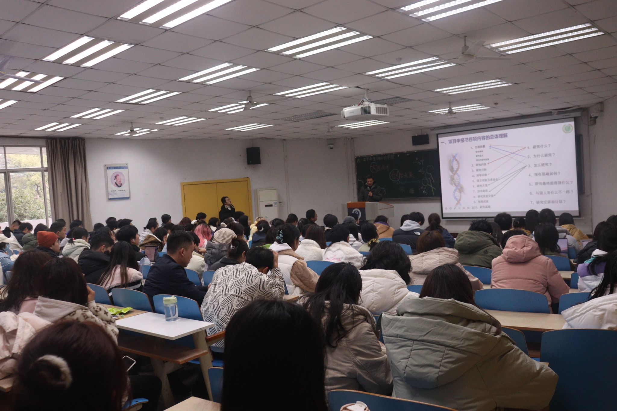 在提问解答环节,两位老师向同学们详细解答了大创项目与个人未来发展的关系。此外,两位老师还具体讲解怎样合理安排经费预算等相关问题,同时向大家提出“认真负责,严禁虚假”的学术道德要求。