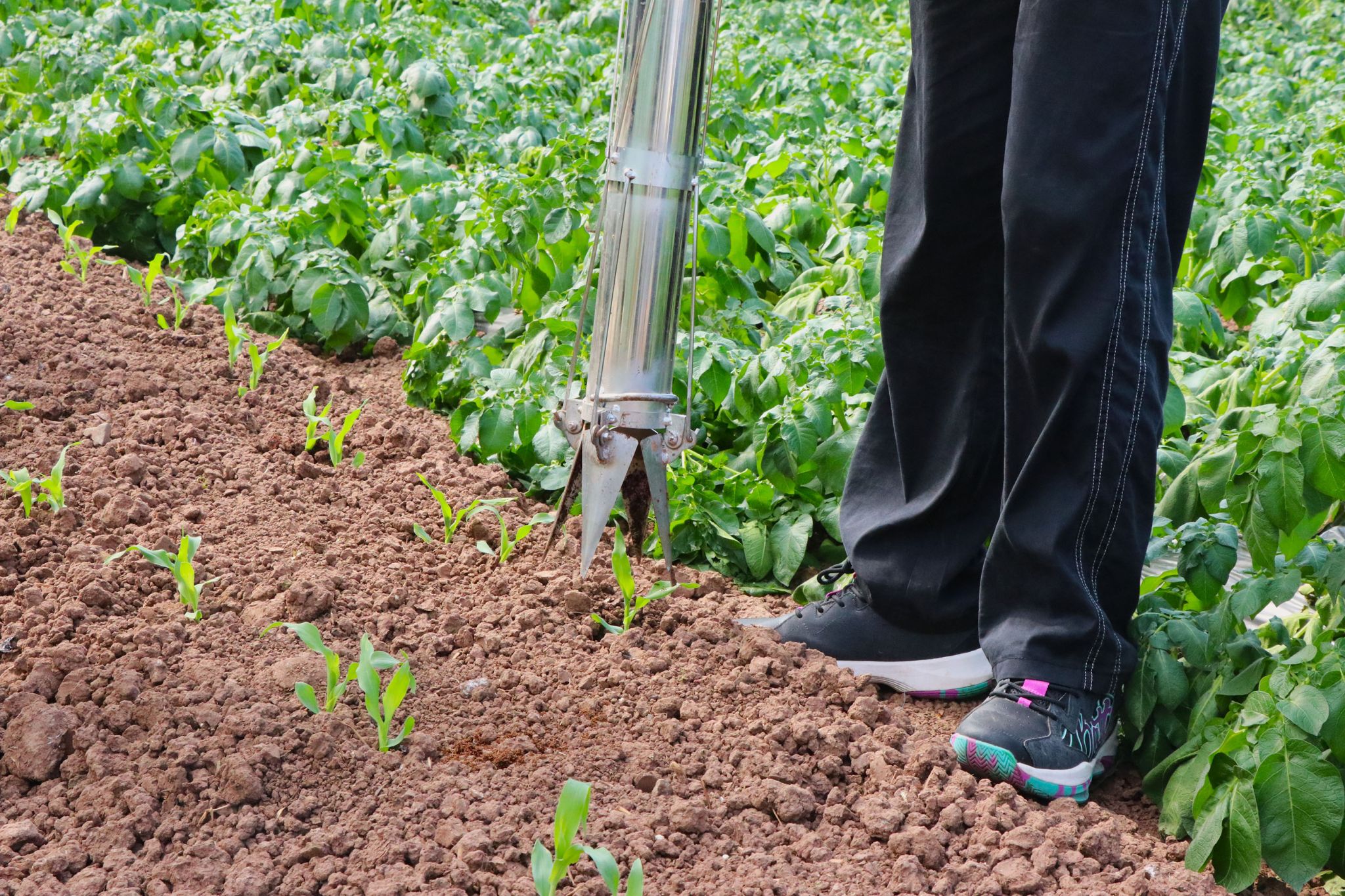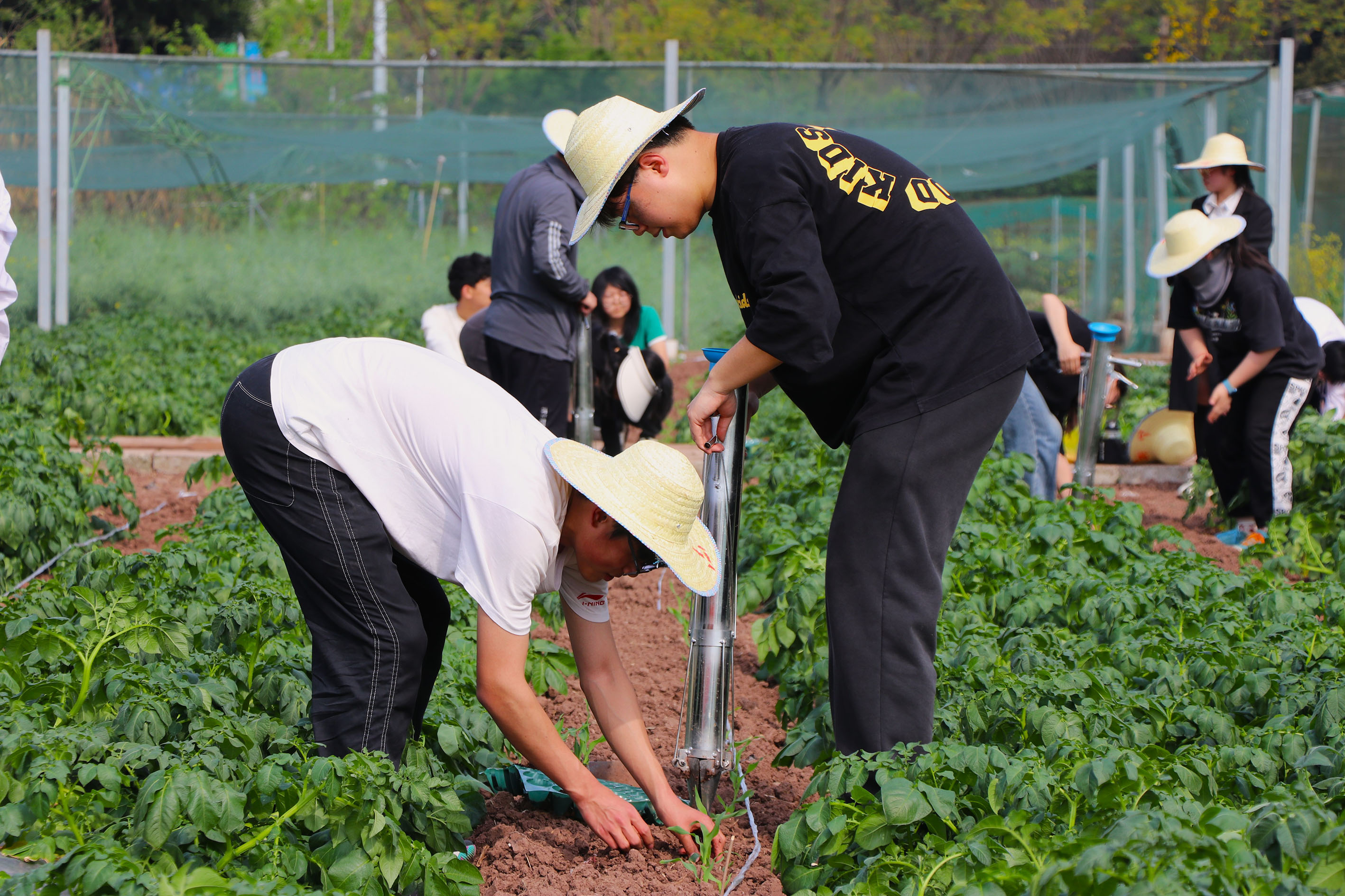 随后,同学们分组协作,开始实践操作。体验者和农学专业同学分组结对,相互配合,井然有序。他们先利用线绳和测量工具进行了精确的测距挖窝工作,确保玉米的根系发展和营养吸收有合理的空间。接下来,进入移栽环节,体验者们在农学专业同学的指导下,小心翼翼地将幼苗从育苗盘中取出,利用栽苗器移植到已经挖好的窝中。然后,大家按照先前计算的玉米需肥量,进行施肥和浇水操作,保障玉米后续生长有充足养分水分。移栽现场同学们热情饱满,认真投入。经过一个多小时的辛勤劳作,一行行玉米苗整齐地在田间昂首挺立,焕发出勃勃生机。