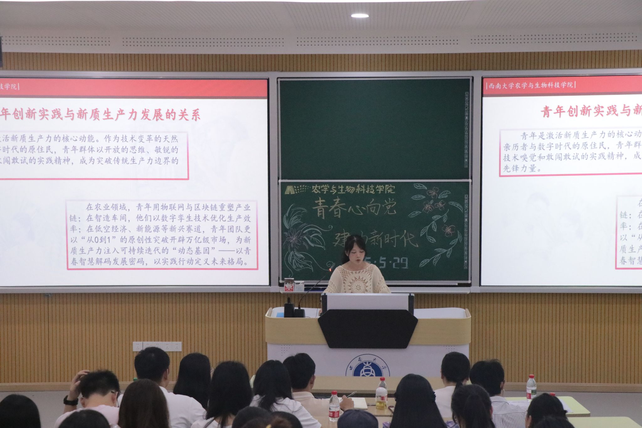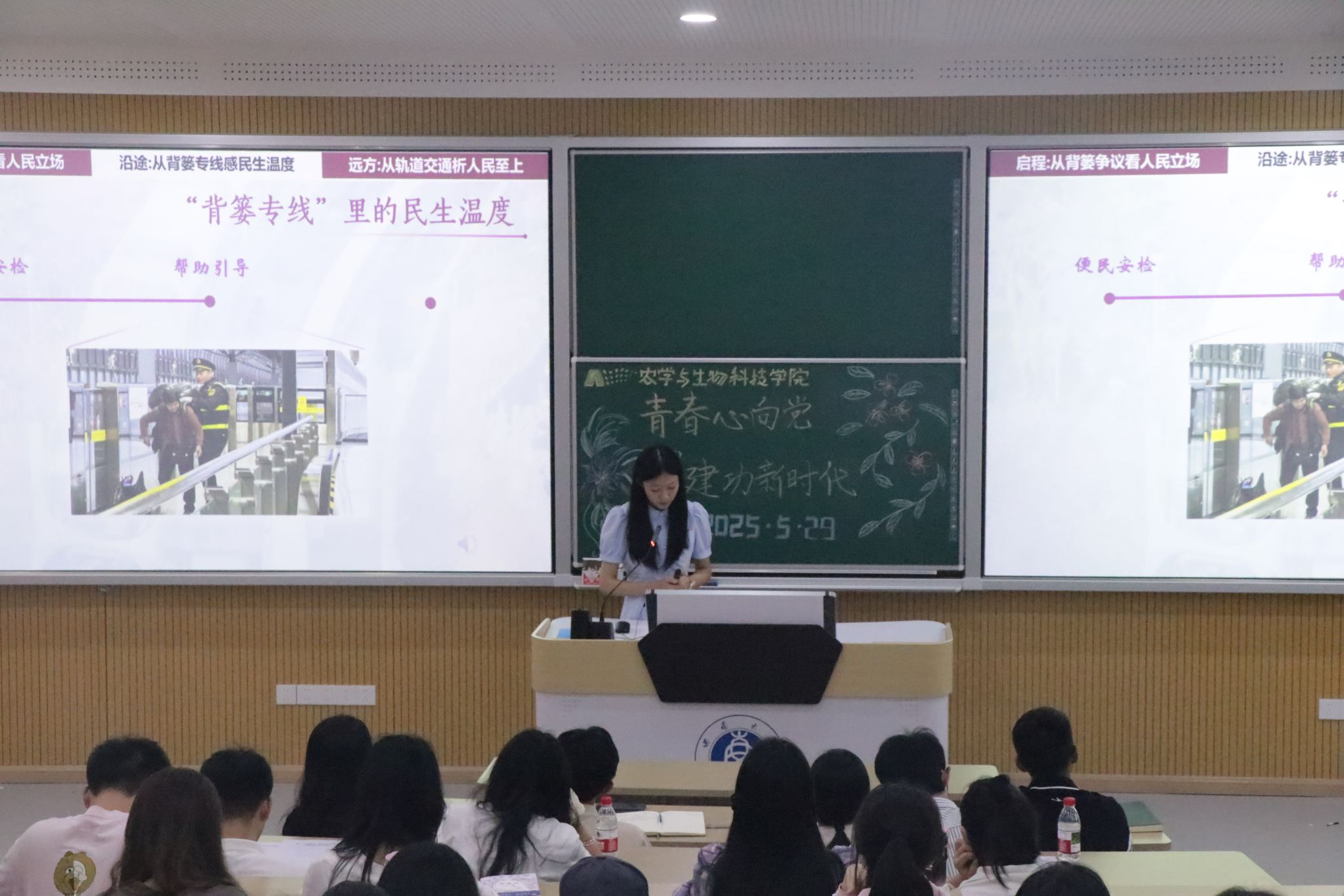 来自2023级、2024级的7名同学紧扣“青春心向党,建功新时代”的主题,依次带来了精彩的微团课展示。他们巧妙融合自身专业知识与当下时代热点,从多元视角切入,为大家呈现了一场思想与激情交织的视听盛宴。