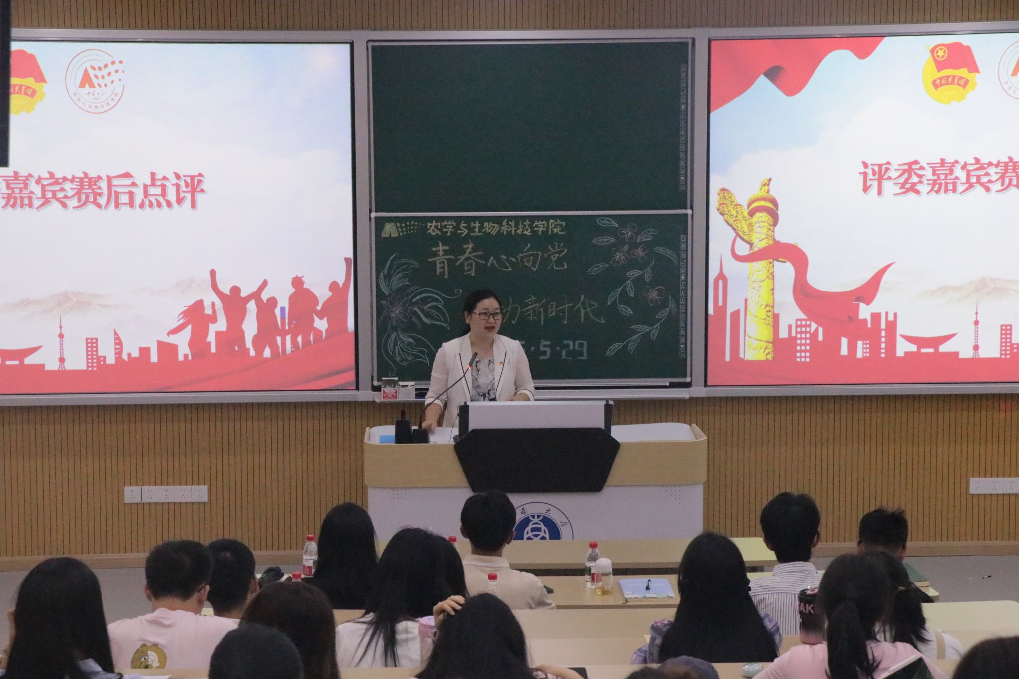 团委书记兼2023级辅导员许莹竹老师、2024级辅导员王皓老师、各党支部党员代表出席活动并担任评委。团校学员、入团积极分子等到场观摩学习。
