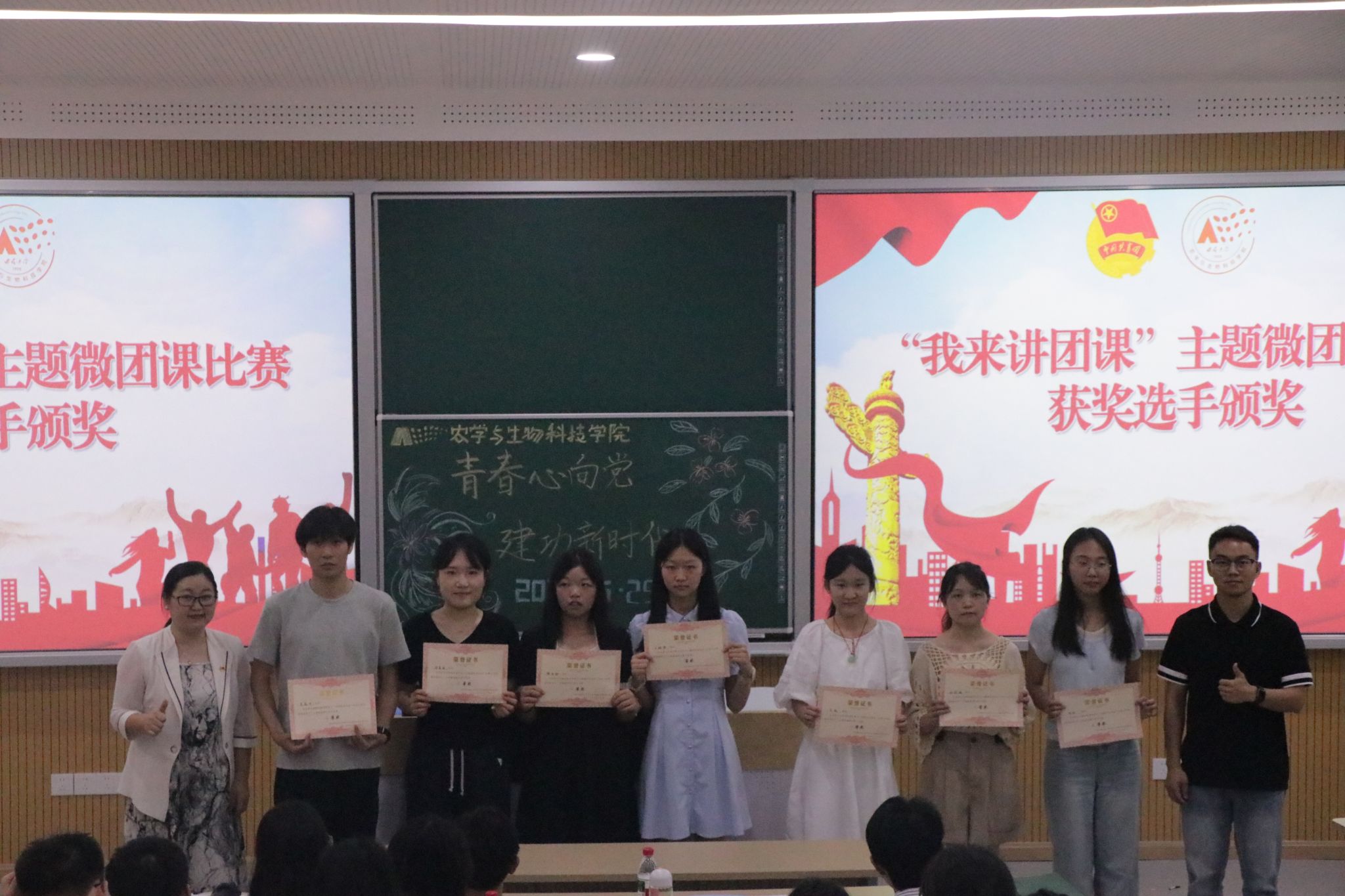 赵蔚晴同学聚焦“新质生产力发展与青年创新实践”,深入浅出地阐述了创新在新时代的关键意义,呼吁同学们要不畏艰难、勇于创新,勇担时代赋予的使命;吴晓同学则以“青衿之志映山河,共筑民族一家亲”为主题,通过生动的案例和真挚的情感,呼吁同学们铸牢中华民族共同体意识,树立正确的世界观、人生观、价值观;范鑫宇同学围绕“团员需要拥有的意志品质”展开论述,引导同学们深入思考如何成为一名自信积极、善于思考的模范团员;王柳静同学以重庆轨道交通“解锁百亿客流,坚持人民轨道为人民”的实例,对“坚持以人民为中心的发展思想”这一主题进行了深刻阐释;陈雨鲜同学着眼于“数字中国建设,青年能力素质提升”,提出将青年共鸣与现代数字议题相结合,能化为照亮前路“三昧真火”的独特见解;向欣同学围绕“‘双碳’目标下,以青春力量绘就生态文明新画卷”,深入探讨了生态文明建设中青年的担当作为;邵嘉琪同学以“播撒绿色基因——农学青年的‘双碳’育种使命”为主题,从多个维度论述了实践与行动的重要性。选手们准备充分,不仅PPT制作精美,内容丰富详实,讲授技巧也十分出色。他们或慷慨激昂,或娓娓道来,用富有感染力的语言和独特的视角,为同学们呈现了一堂堂精彩纷呈、令人印象深刻的微团课,赢得了现场观众的阵阵掌声。