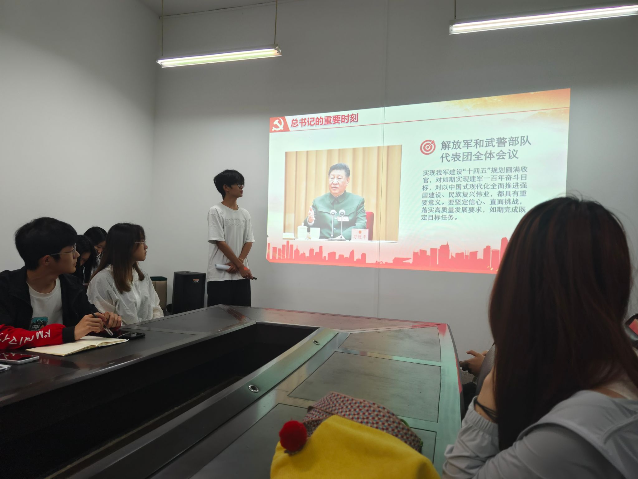 办公室程瑾瑞同学以清晰的逻辑和饱满的热情,围绕习近平总书记在全国两会期间的重要讲话精神、2024年经济社会发展各项成果的意义、2025年政府重点工作任务规划等主题展开领学,并详细解读了如科技创新与产业创新融合的战略意义、“十四五”规划收官之年各项经济目标设定依据等内容,帮助同学们全面理解2025年全国两会精神的内涵与实质。