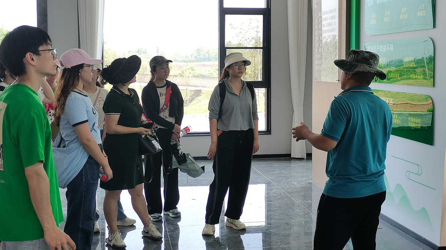 随后,在侣俸镇副镇长孙贤菊的带领下,同学们参观了铜梁侣俸镇乡村振兴特色项目巴岳农庄。在巴岳农庄设施蔬菜科技园的温室大棚里,同学们见识了个头大、品质优的螺丝椒、花青素含量极高的黑紫色辣椒、红色和黄色挂满枝头的番茄,品尝了甘甜的“银河系列”小番茄,了解了温室大棚通过转光膜、反光薄膜等增强光照效果的技术,让大棚在没有任何照明设施的情况下却比户外更亮,大大提高辣椒和番茄的生长速度。在项目展厅,侣俸镇产业中心负责人杨昌武为同学们详细讲解了巴岳农庄的实践模式,“巴岳农庄不是一个具象的农场、庄园概念,而是推动乡村发展产业的一种模式、一条路径。”同学们从生产要素激活、创新经营管理模式、社会化服务等一幅幅图片、一幕幕规划图中学习铜梁乡村振兴路径。相信在未来此地将是大量优秀新农人的聚集地。