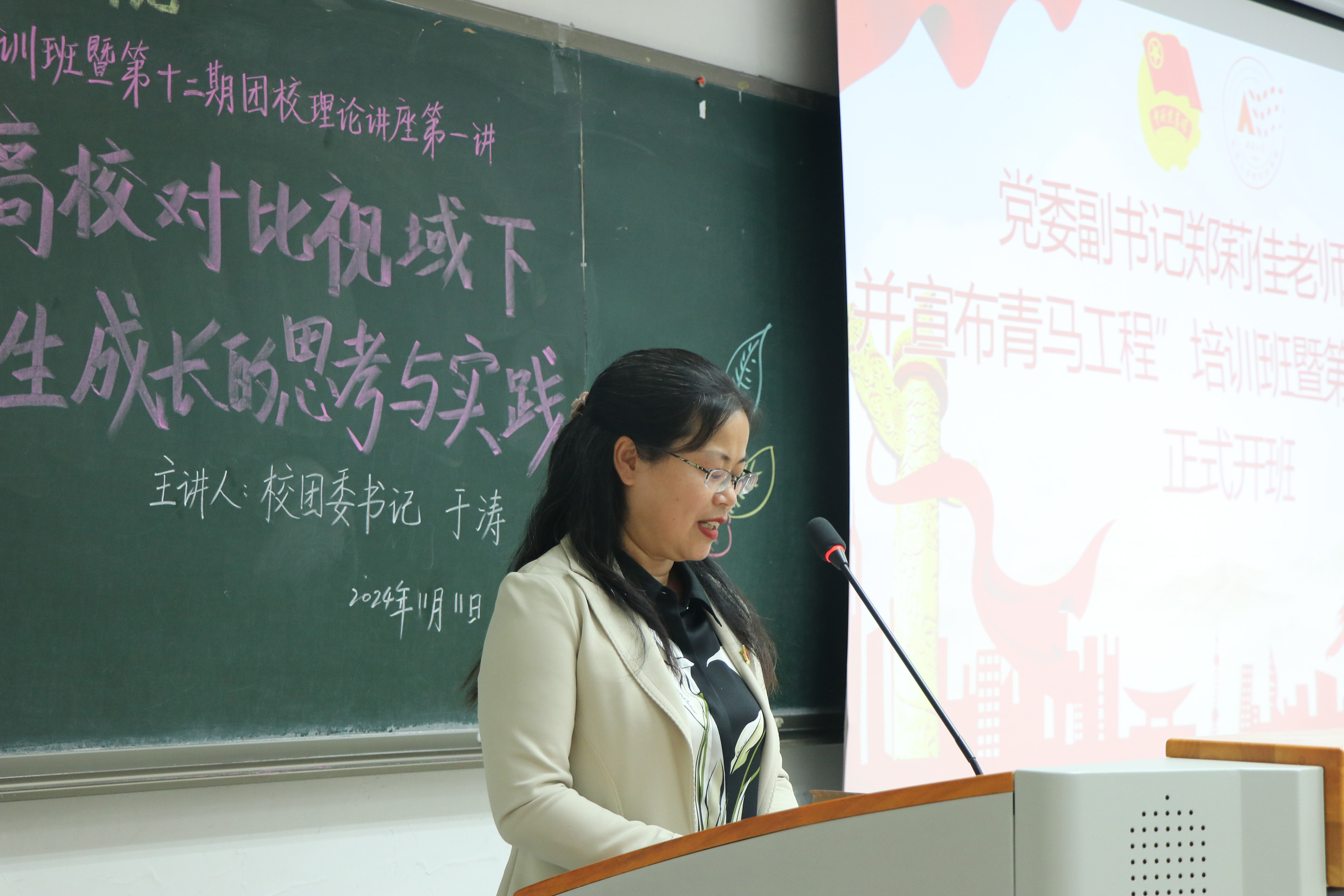 党委副书记郑莉佳老师讲话并宣布“青马工程”培训班暨第十二期团校正式开班,她向团校学员们提出了三点期望:一是要坚定"泰山在前而不见,急雷破柱而不惊"的理想信念,淬炼初心"本色";二是要练就"千磨万击还坚劲,任尔东西南北风"的过硬本领,坚定奋斗"底色";三是要投身"长风破浪会有时,直挂云帆济沧海"的强国伟业,赓续使命“红色”。希望学员们学 有所思,学有所获,学以致用。