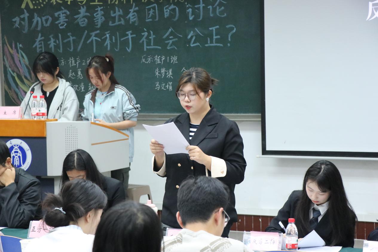 反方2025级植物生产类1班主张“对加害者事出有因的讨论,不利于社会公正”。他们结合现实案例与社会舆论效应指出,过度讨论加害者的背景与动机,容易模糊案件焦点,弱化加害者的法律责任,进而可能侵害受害者的合法权益,偏离社会公正的根本目标。