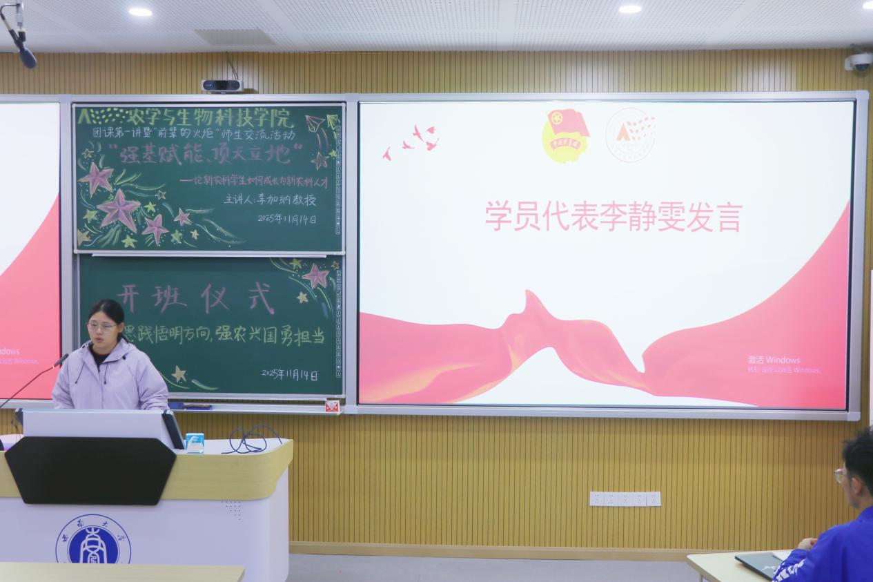 随后,学员代表李静雯同学发言,她将本次团校比作学习党团理论的“思想加油站”与锤炼本领、增长本领的“实践练兵场”,结合习近平总书记“乡村全面振兴,人才先行”的重要论述,她发出青春倡议:全体学员将以此次培训为契机,以饱满的热情、扎实的学风严守纪律、勤思笃行,把理论知识转化为服务乡村振兴的实际行动,让青春在广袤田野上绽放光彩。