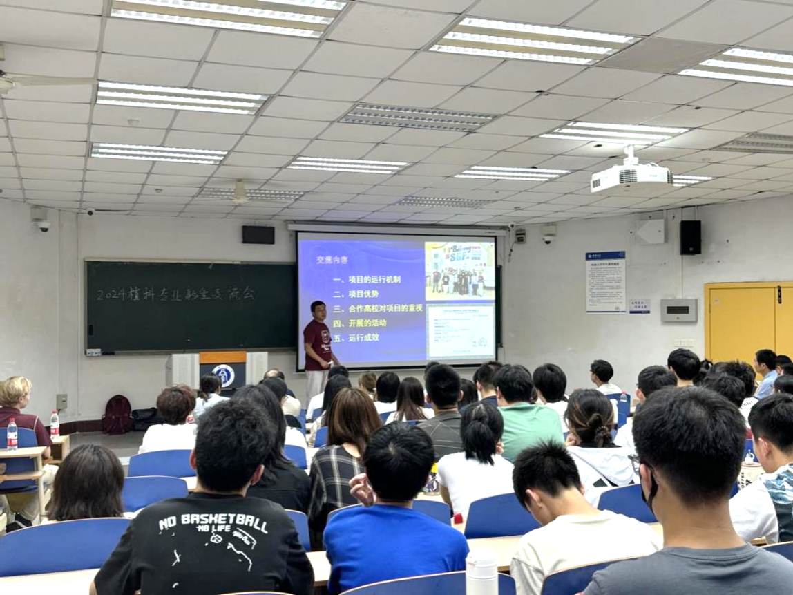 2021 级植科专业的田晨希同学,现已保送至武汉大学。作为学生代表,她向学弟学妹介绍了本项目的优势,包括双学位体系、先进的课程与教学模式、中外教师团队、国际化视野,经济实惠的教育成本、深入的合作关系、高保研率及与 MSU 本校区相同的资源机会。田同学还分享了实用的学习经验,如时间管理、笔记技巧、思维导图的创建、优先级排序和多样化的复习方法,她强调了大学生活伊始要规划好学业和科研,思考未来发展路径,如转校区、推免、就业或考研等,同时建议早接触科研和多参与实习,以提升能力。